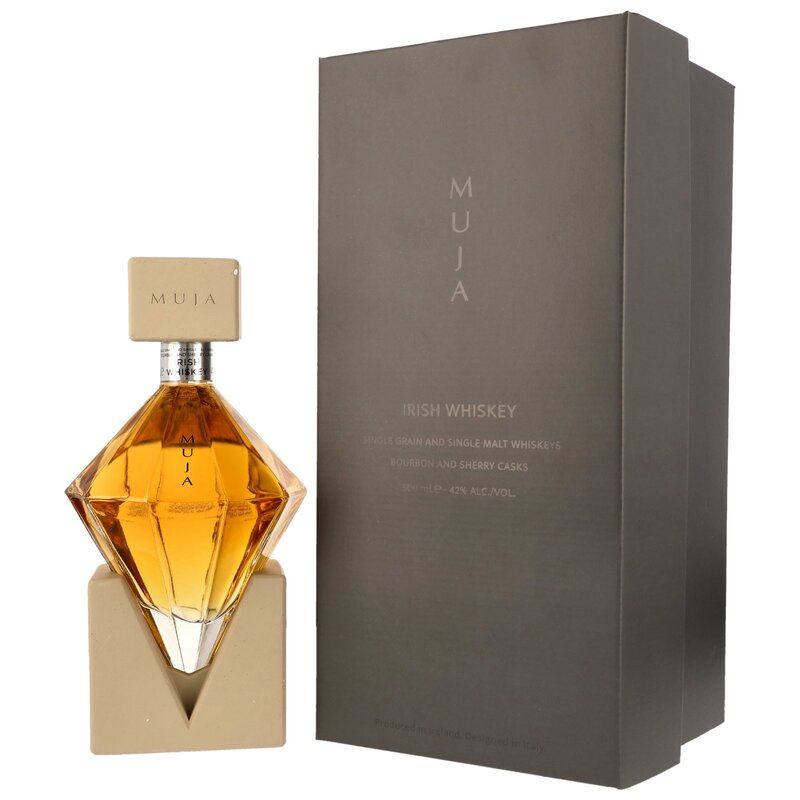 Besonderheiten: Der Muja Blended Irish Whiskey vereint meisterhaft irische Whiskey-Tradition mit italienischem Design. Durch dreifache Destillation und doppelte Reifung in ehemaligen Bourbon- und Sherry-Fässern entsteht ein vollmundiger und fruchtiger Blend. Die markante, diamantförmige Flasche mit Betonverschluss und schwerem Sockel, gefertigt in der Nähe von Triest, spiegelt die Verbindung von irischer Whiskey-Kultur und italienischem Lifestyle wider.