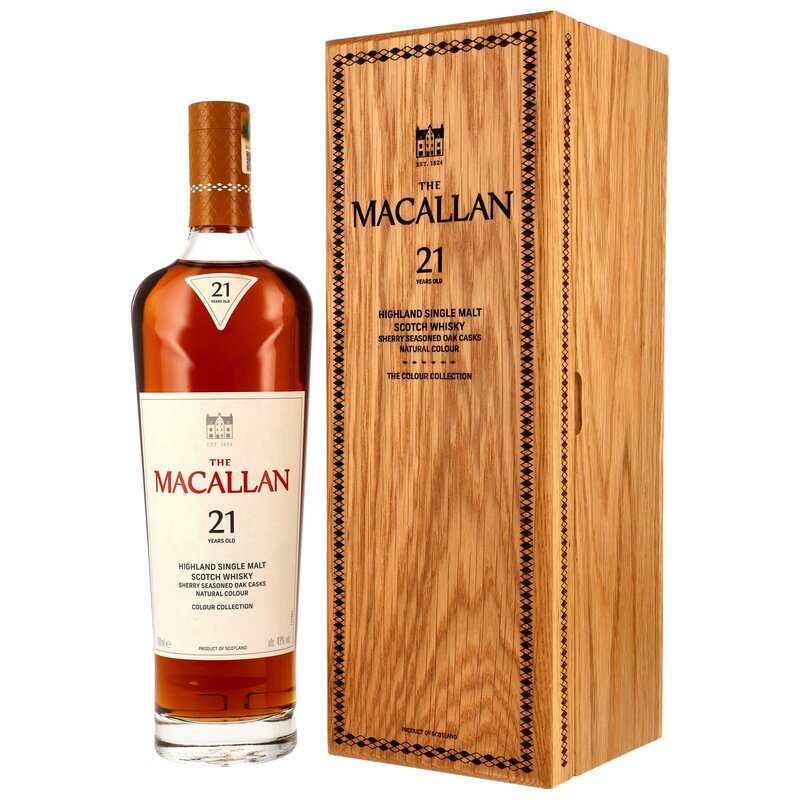 Besonderheiten: Die Macallan 21 Jahre Colour Collection präsentiert sich in einer edlen Holzbox und besticht durch ihre natürliche Farbe ohne Zugabe von Farbstoffen. Der Whisky wurde nicht kühlfiltriert, was zu einem volleren Geschmackserlebnis beiträgt. Die Reifung erfolgte in einer Kombination aus amerikanischen Eichenfässern und mit Sherry vorbelegten Eichenfässern, was dem Whisky komplexe Aromen verleiht.