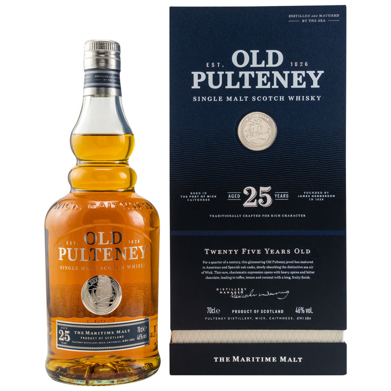 Special features: This 25-year-old Old Pulteney represents the essence of the Scottish coastal region. After 22 years in former American bourbon casks, it received an additional maturation of three years in Oloroso sherry casks, resulting in remarkable depth and complexity. This bottling replaces the previous 17- and 21-year-old variants from the Pulteney Distillery.