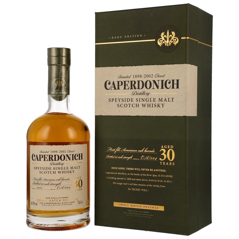 Special features: This 30-year-old single malt whisky from the closed Speyside distillery Caperdonich was matured in first-fill American oak casks and bottled at 46.9% vol. The bottling is not chill-filtered and contains no coloring. It is presented in an attractive box.