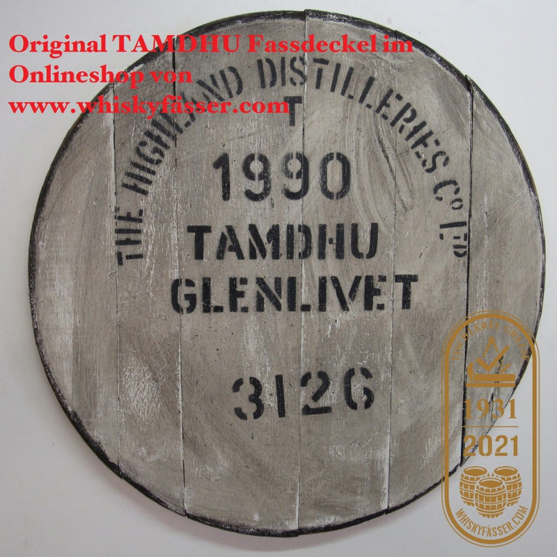 Original barrel lid from the Tamdhu distillery. The corresponding barrel was last filled in 1990. To ensure the highest quality, it was carefully selected from our suppliers and will be completed for you with loving craftsmanship by our carpenters. As a decorative highlight of a room or an exclusive table.