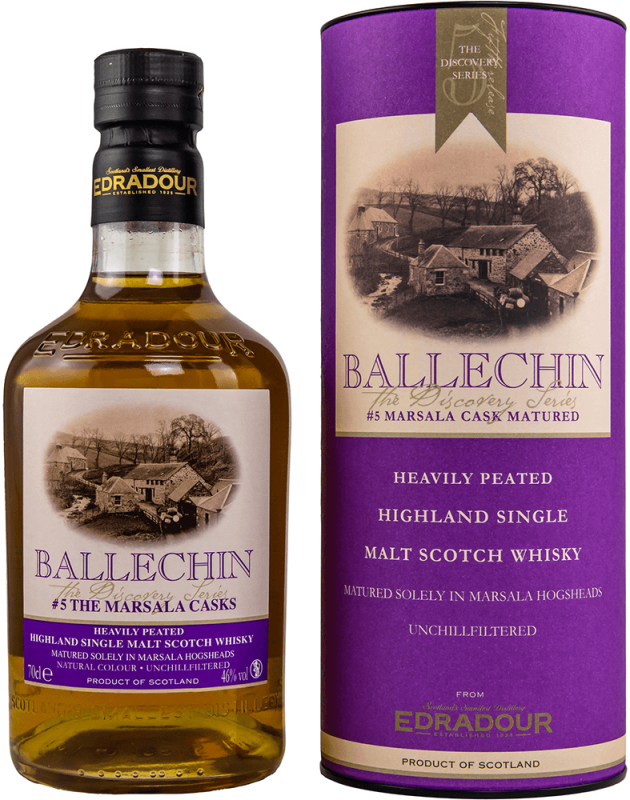 Particularités : Ce whisky single malt limité de la renommée distillerie Edradour a été embouteillé dans la série Ballechin et a mûri entièrement dans des fûts de Marsala de première remplissage. Avec une teneur en phénols de 50 ppm, il se présente comme particulièrement fumé et puissant. L'embouteillage a eu lieu en 2010, et seulement 6 000 bouteilles ont été produites dans le monde.