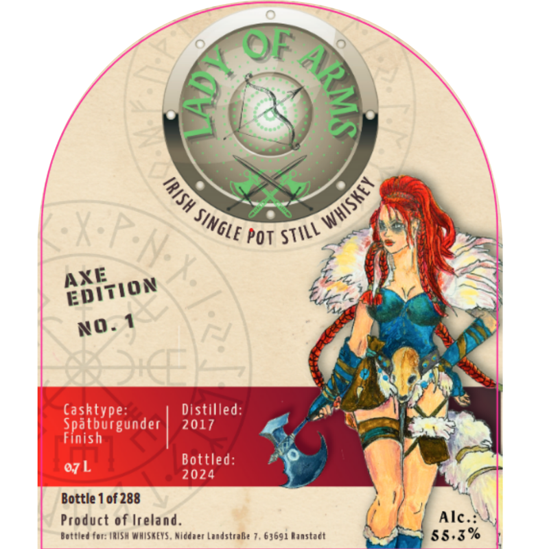 Distillerie/Embouteilleur : Lady of Arms est une série d'embouteillage indépendante alliant tradition et histoire irlandaises à une touche artistique. Cette série est dédiée au symbolisme des guerrières irlandaises. Après les éditions précédentes mettant en vedette des arcs et des épées, celle-ci met l'accent sur la hache. Le whisky a été distillé en 2017, puis affiné en Irlande avant son affinage final en fûts de pinot noir.