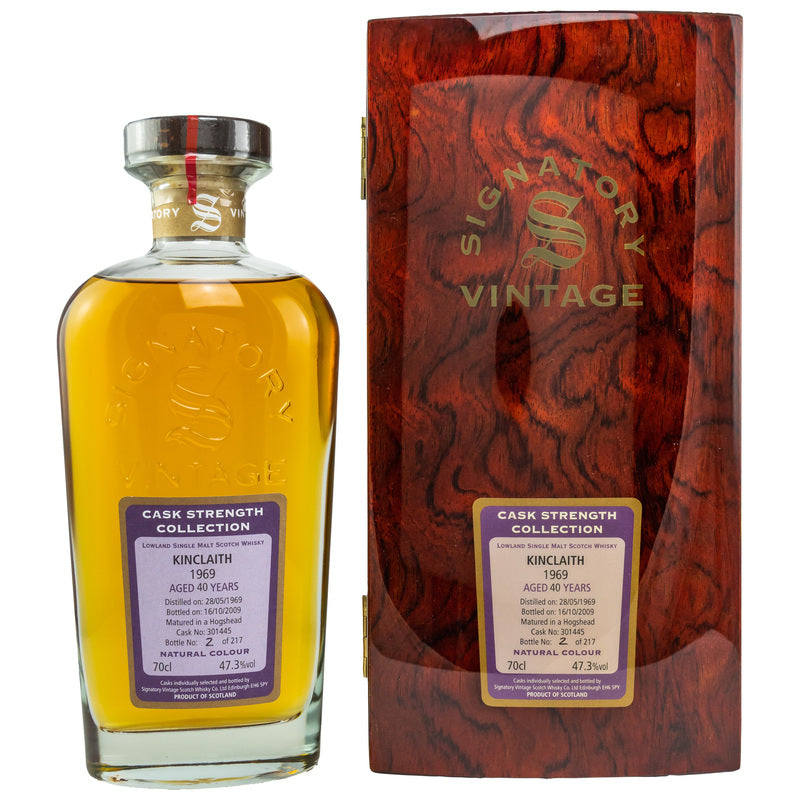 Particularités: Ce rare Single Malt de la distillerie Kinclaith, désormais fermée, dans les Lowlands se distingue par son vieillissement de 40 ans en fût Hogshead. Il a été mis en bouteille en 2009 à la force du fût avec 47,3 % d'alcool, limité à seulement 217 bouteilles. La mise en bouteille provient de la populaire série Rare Reserve de Signatory Vintage et se présente dans une élégante boîte en bois.