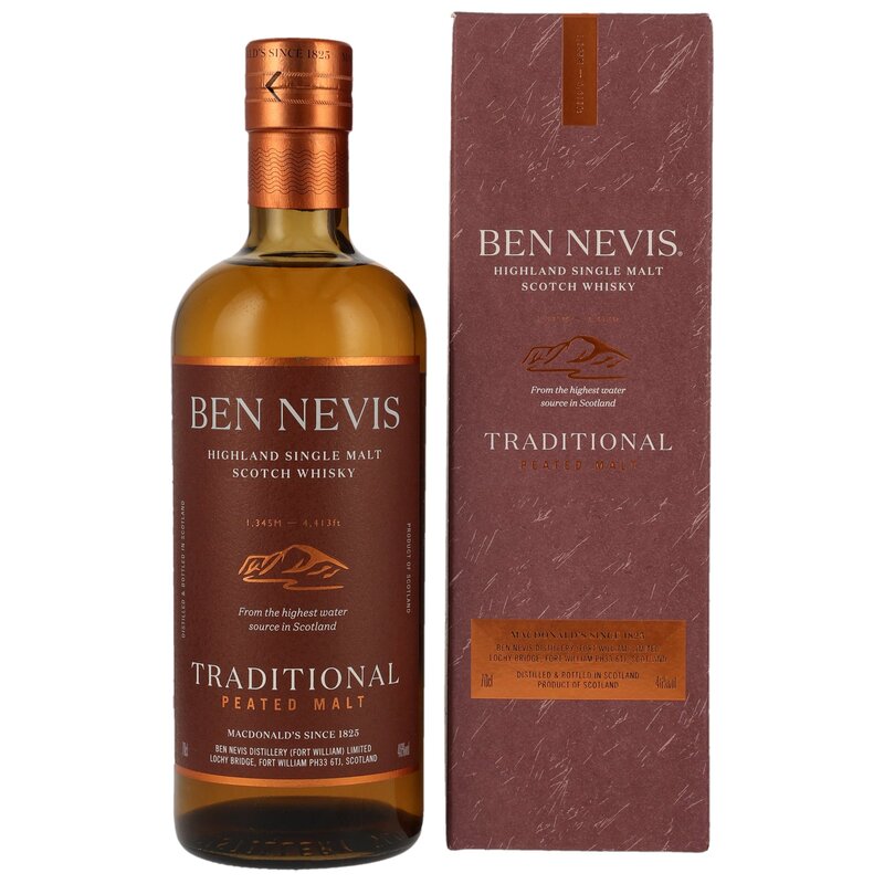 Particularités : Le Ben Nevis Traditional Peated Malt est un hommage aux traditions de la fabrication du whisky écossais. Embouteillé pour la première fois en 2011 en édition limitée, ce Single Malt utilise de l'orge tourbée et rappelle les temps où la tourbe était utilisée pour chauffer le séchoir. L'embouteillage se fait sans colorants et sans filtration à froid, ce qui préserve le caractère naturel du whisky.